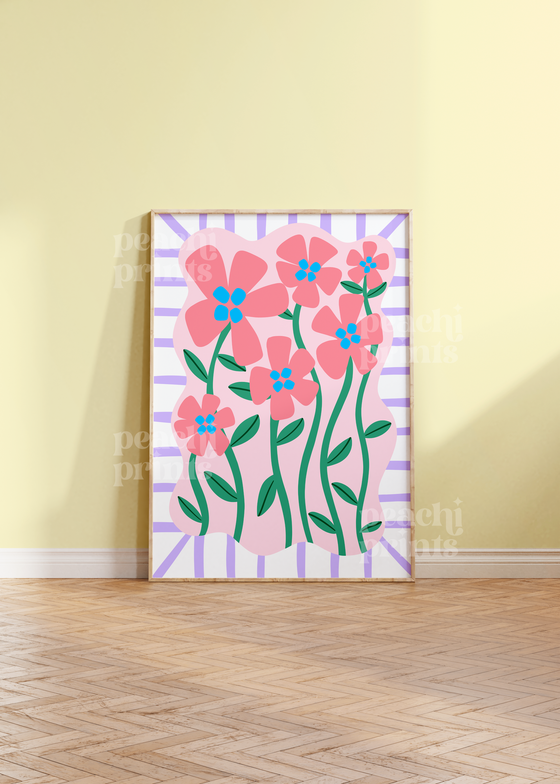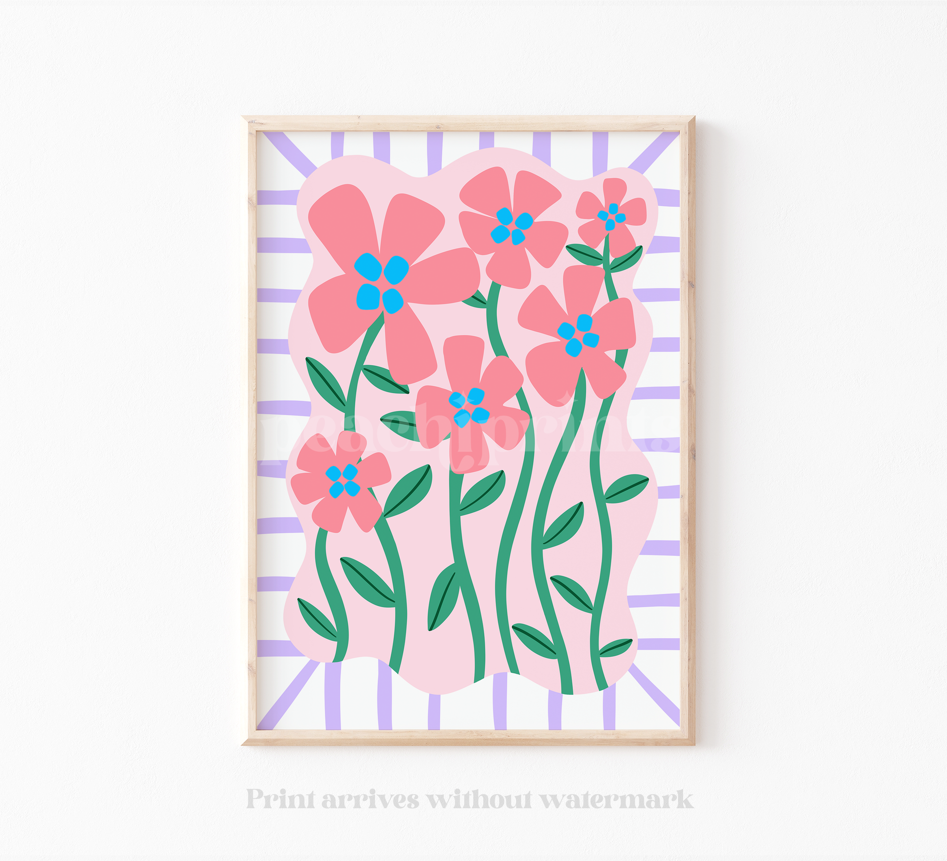 Abstract coral flowers print. Contrasting coral and gorgeous pink and lilac tones work perfectly in this modern on-trend print which will add a splash of colour and femininity to any space. Perfect for a bedroom or living room space, as a large centre piece or smaller for adding to a cute shelf space.