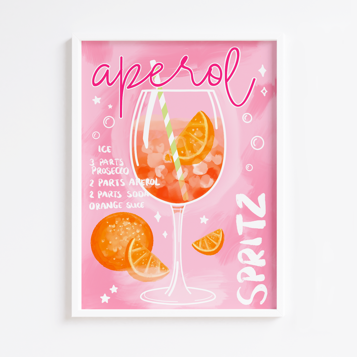 Orange Aperol Spritz inspired cocktail print with recipe! Original hand-drawn illustration by me. This would be perfect for the kitchen or above your at home cocktail bar! It would also make the perfect gift for any lover of this drink!