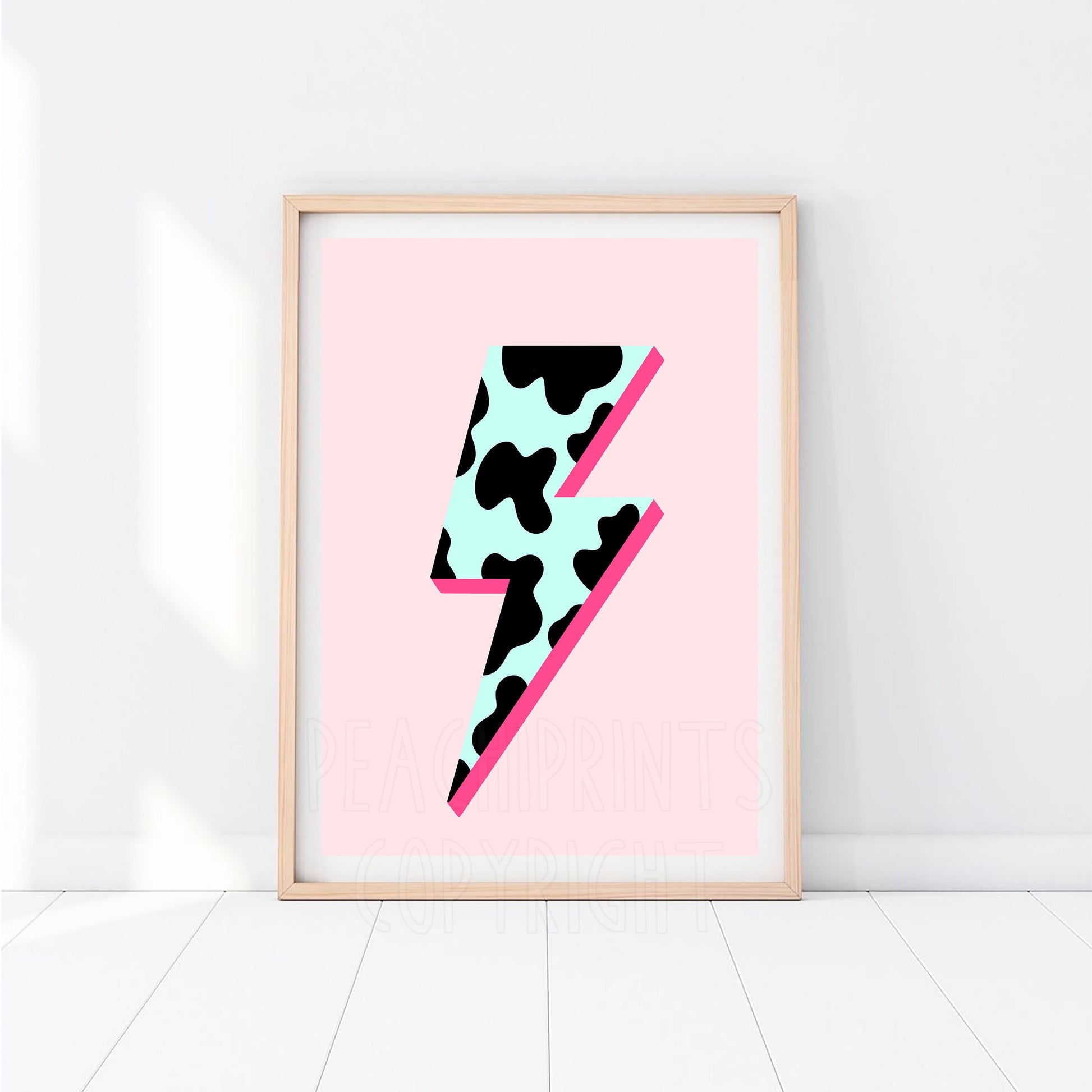 Mint contrasted lightning bolt with a cute cow print on a soft pink background.