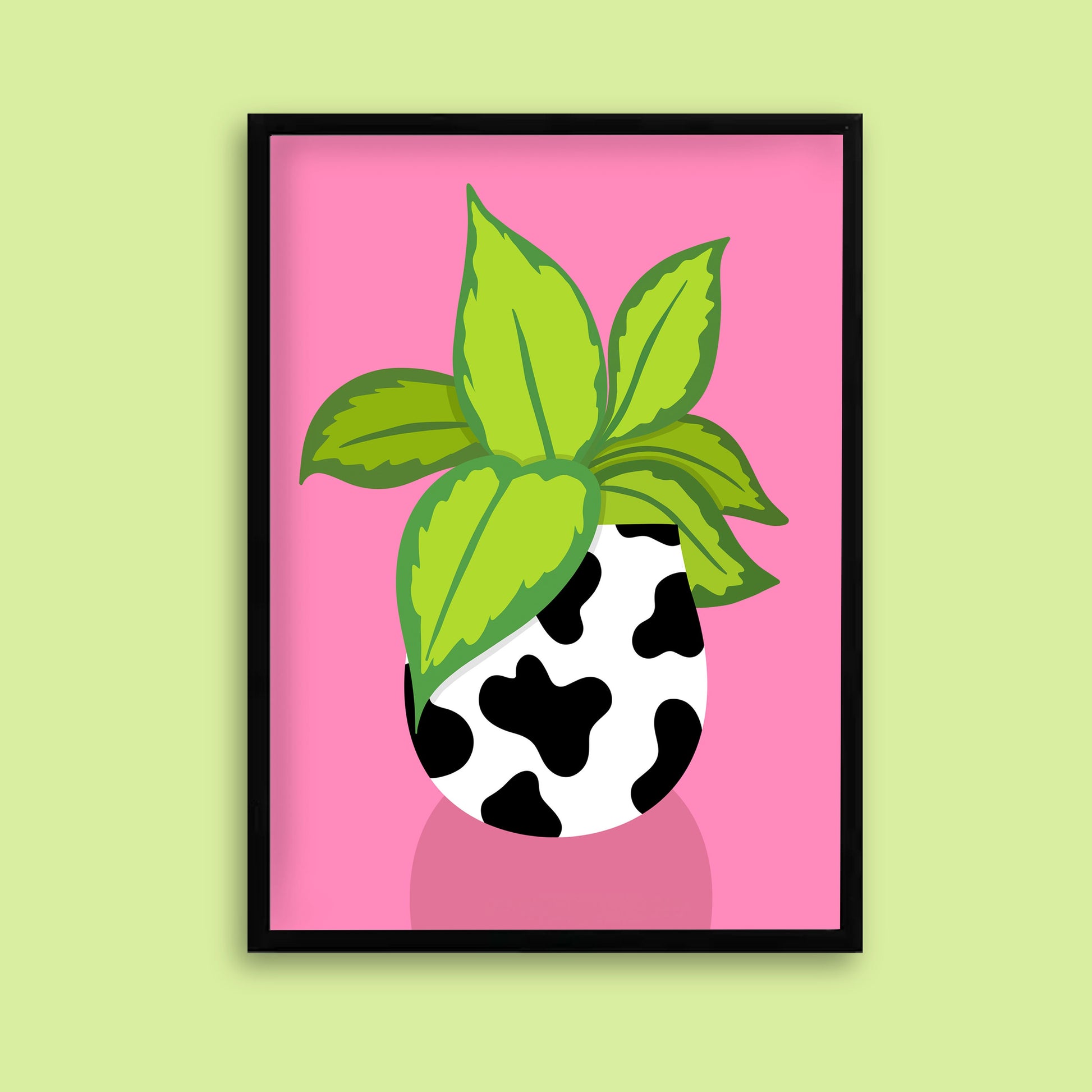 Bright green leaf plant in cow print planter with a lovely vibrant pink background! Original Illustration. Perfect for the living room, bedroom or bathroom to add some colourful botanical beauty!