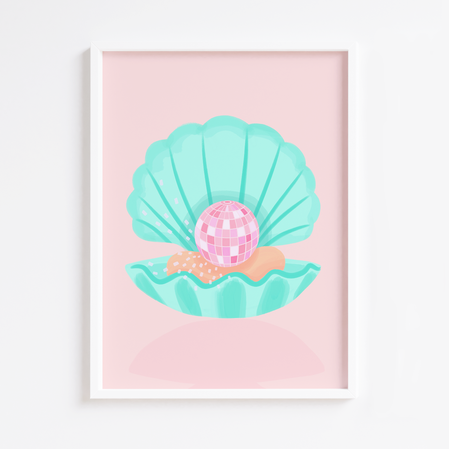 The Disco Clam! Cute pastel shellåÊwith disco ball pearl and contrasting pastel backgrounds! Hand-drawn original illustration print. Perfect to add something different to a bedroom, living room or kitchen where you get you can get your groove on!