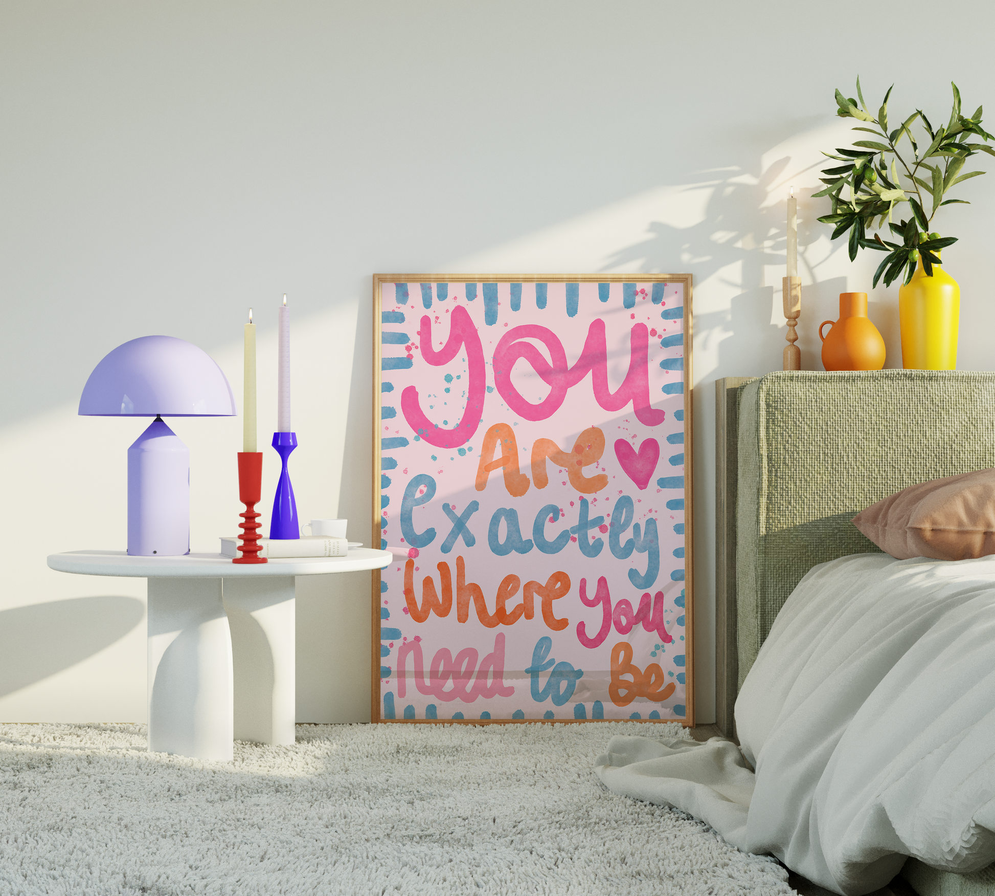Hand-drawn typography in colourful pink, blue  and orange toned watercolour ink with heart and splash details. Perfect print to spread positivity around your home and would make the perfect motivational gift for any friend or loved one!