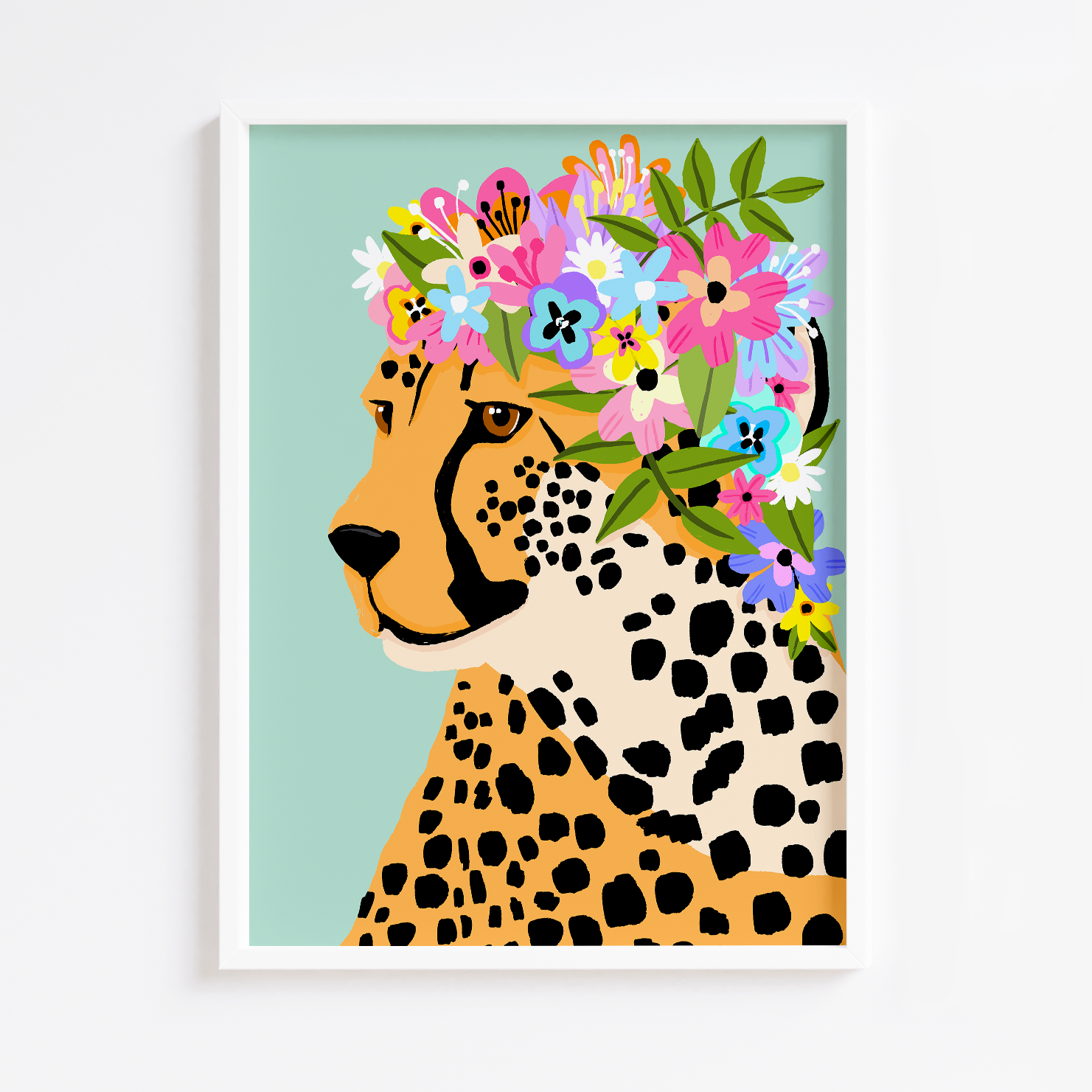 Flower Crown Cheetah Print. Hand drawn illustration with a vibrant mix of flowers against a soft mint green background. Add a splash of vibrant colour and happiness to your home with this gorgeous fella! This would look fabulous framed anywhere in your home as it is so lovely and versatile! Also available in pink!