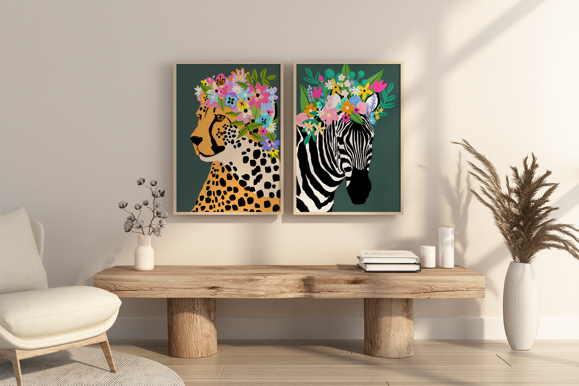 Floral Crown Zebra Print. Hand drawn illustration with a vibrant mix of flowers against a dark greenåÊbackground. Add a splash of vibrant colour and happiness to your home with this gorgeous fella! This would look fabulous framed in your kitchen, living room or bathroom! Also available in pink, mint, lilac and lemon yellow.
