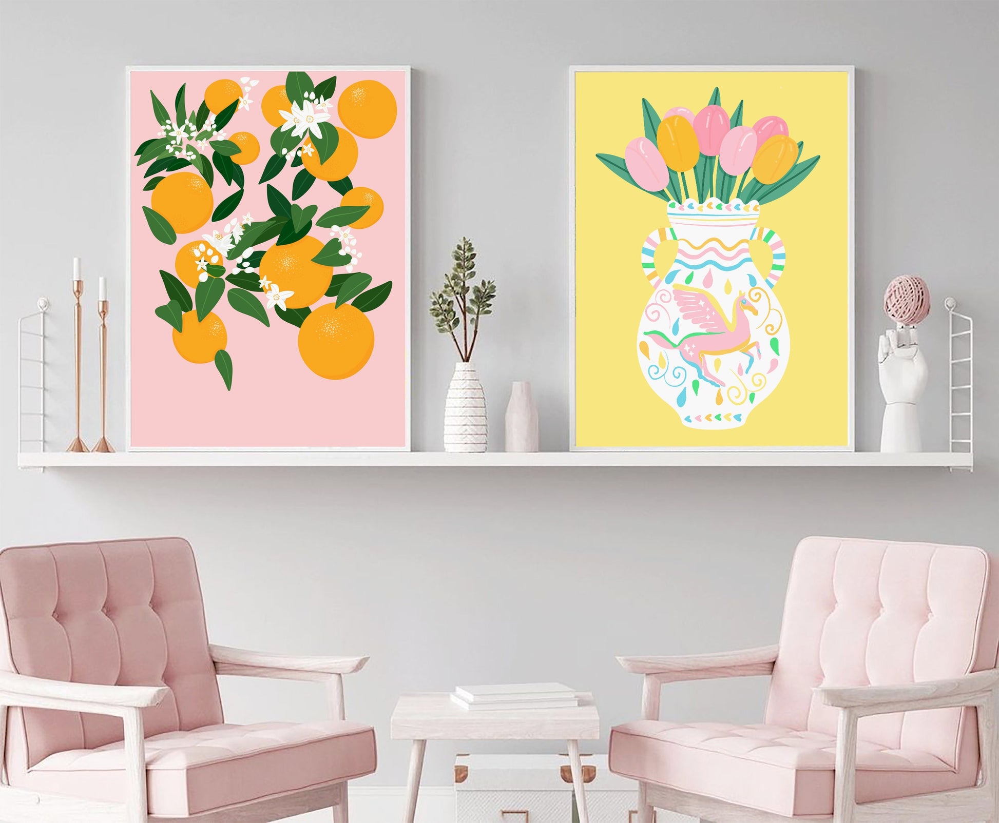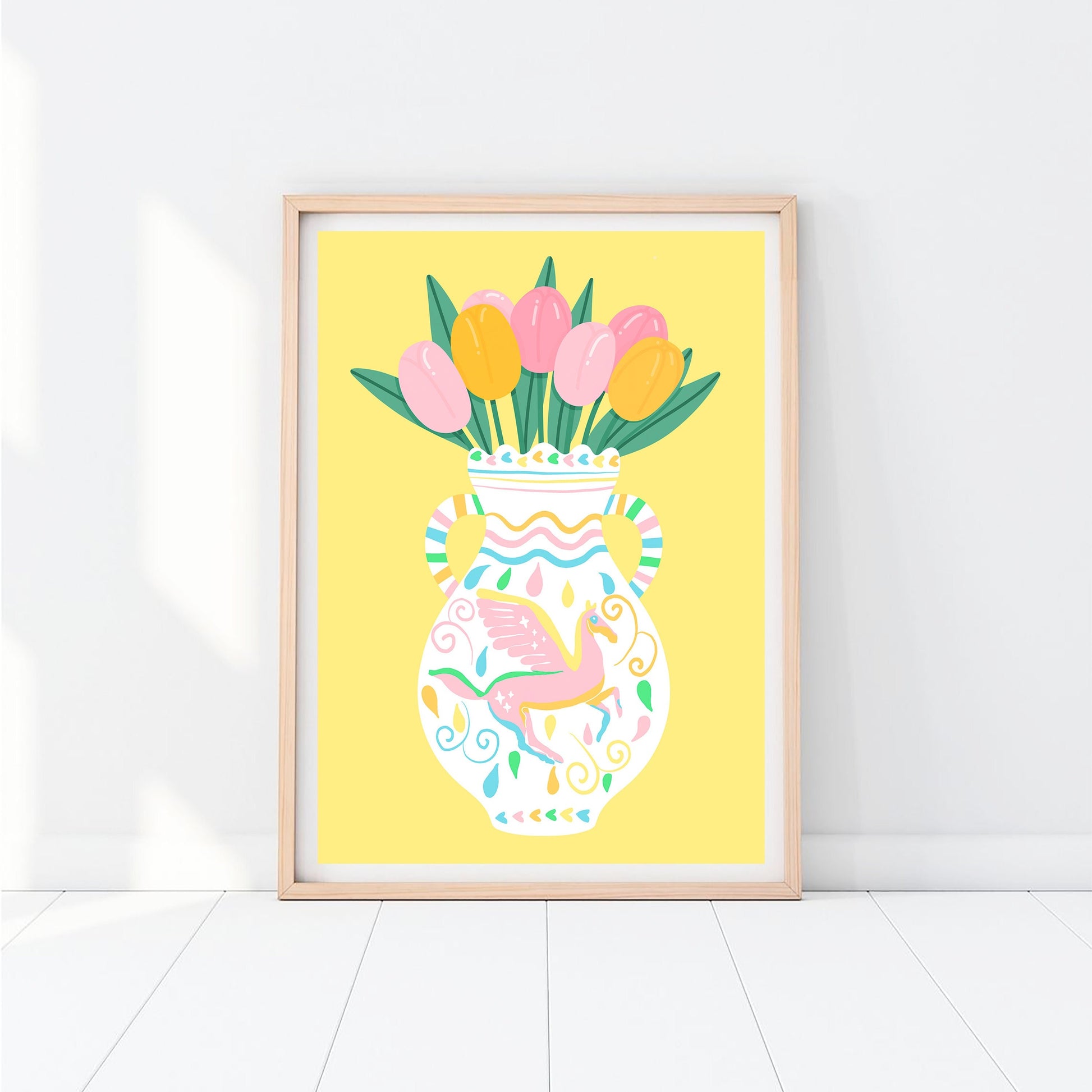 A beautiful pastel coloured Greek vase with colour coordinated tulips, against a happy soft yellow background! Perfect for the brightening up the bathroom, bedroom or hallway and adding some happy colour!