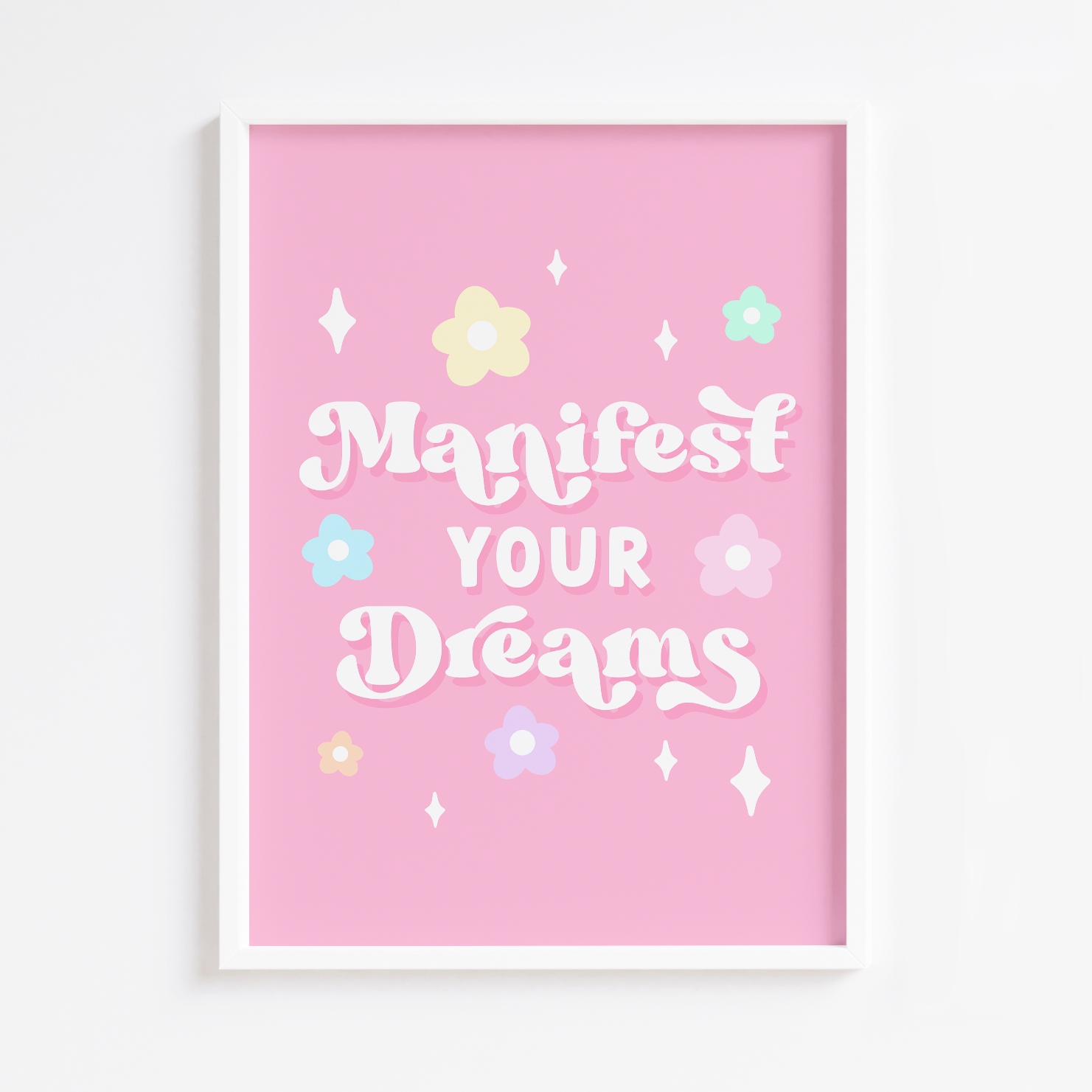 Manifest your dreams print. Girly and cute way to motivate you every day, whether in your office or bedroom! Or the perfect gift for anyone who needs a boost! Original Illustration and typography.
