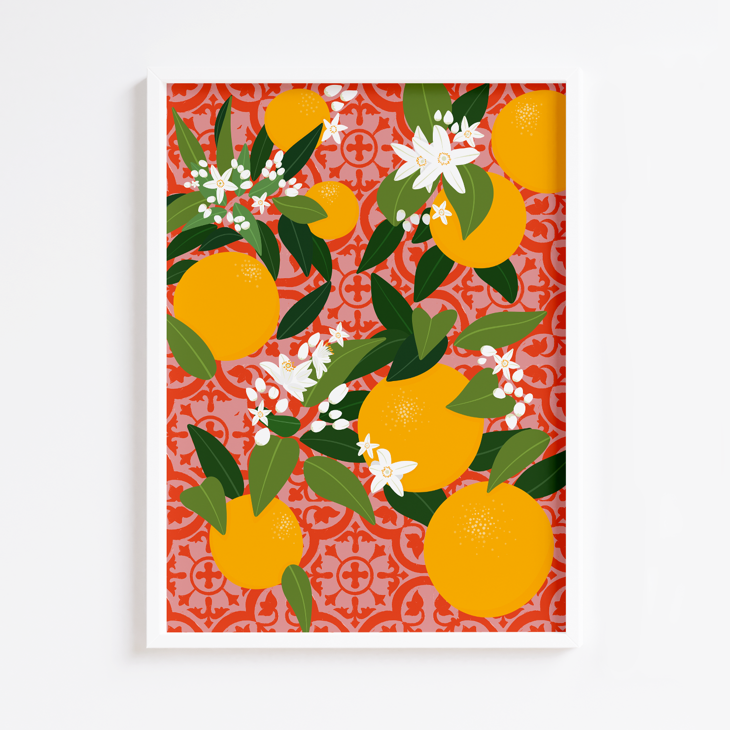 MoroccanåÊTile Oranges Print. Juicy vibrant oranges and botanicals against either a blue or coral red tiled background! Perfect to give some charming exoticåÊflair to a kitchen, bathroom or living room!