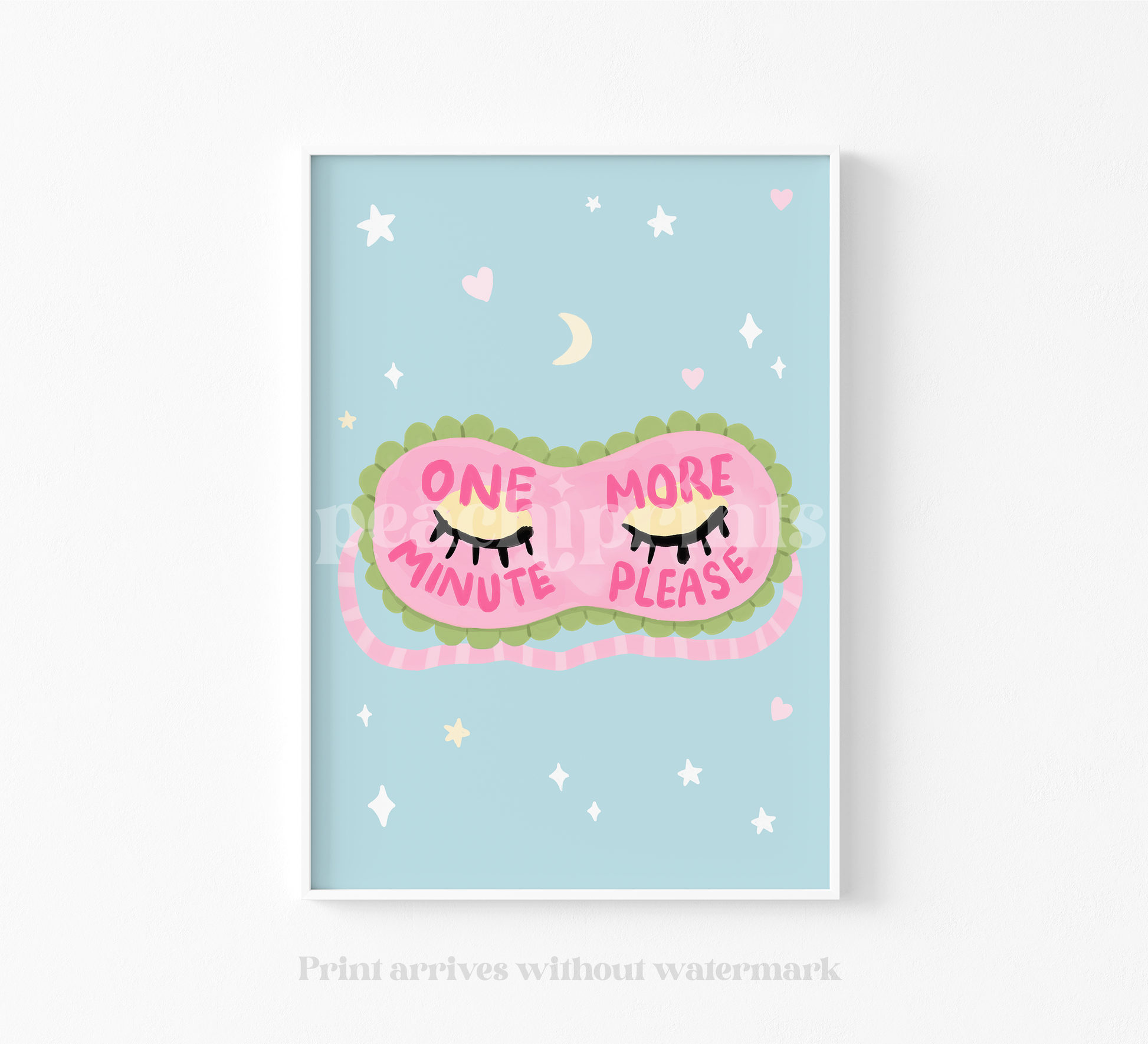 One More Minute Please! Original hand-drawn illustration. This would be fabulous printed large above a bed as a statement piece of unique art or as a smaller print to add gorgeous colour to your bedroom walls while giving a very important message!