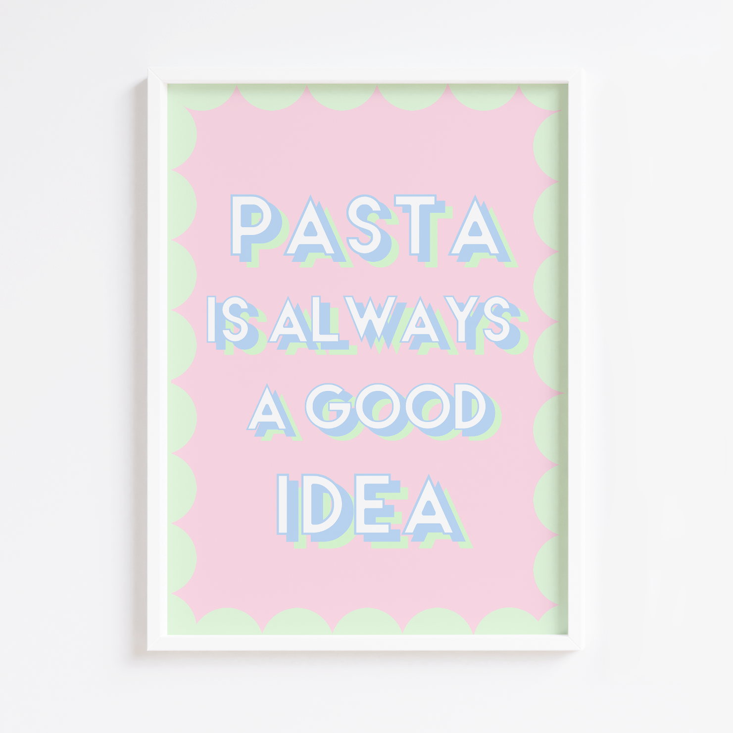 Pasta is always a good idea - who agree's? Pastel typographic print with cute scalloped border. This will be sure to add a statement to your kitchen decor! This would look fab printed large scale as a statement or super cute as a small kitchen shelf print.