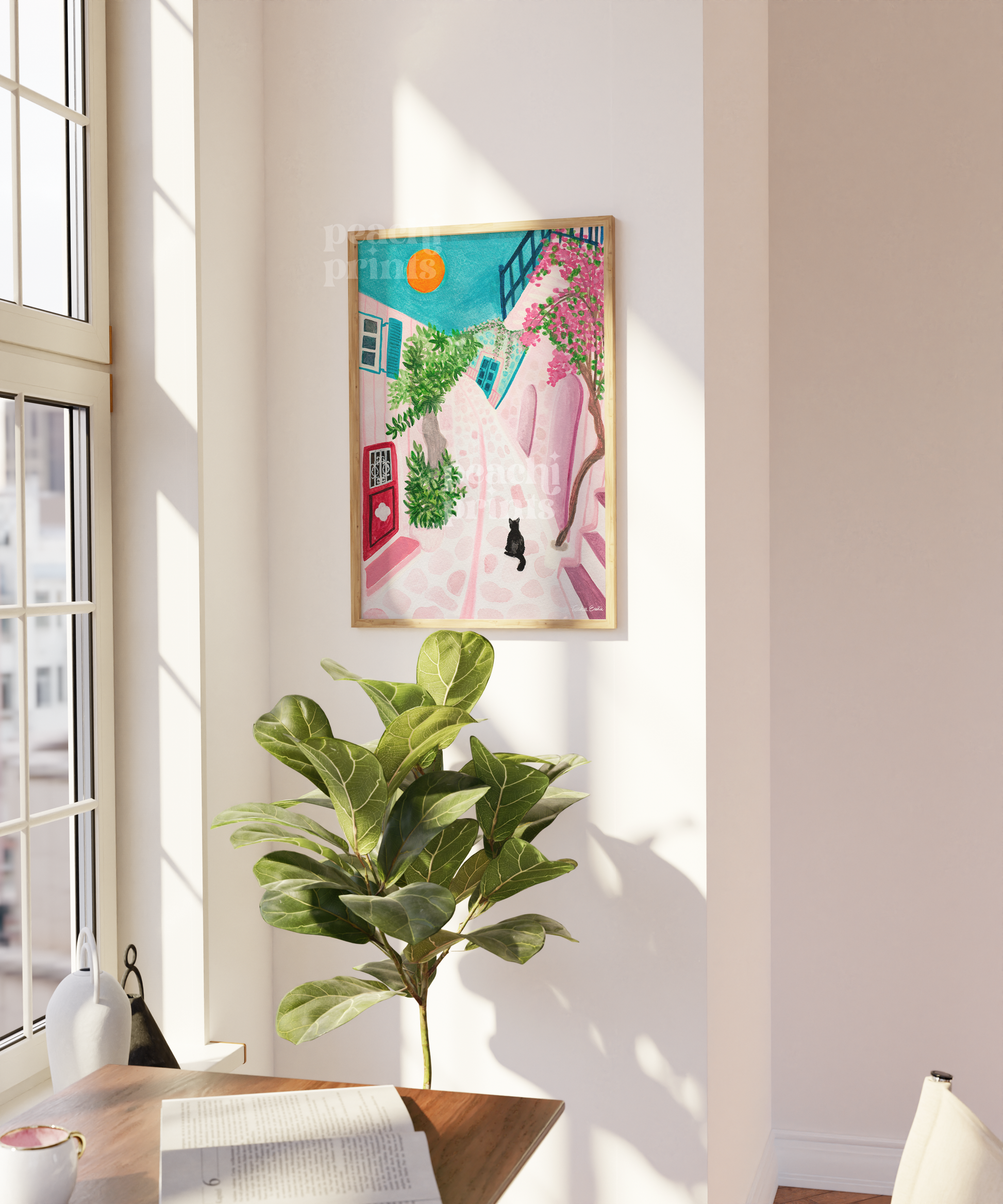 Pink Santorini Streets art print. Quaint greek streets painted in Gouache in a wash of vibrant pastels, featuring a black cat contemplating it's next move! A versatile art print to add some feelings of nostalgia and wanderlust anywhere in the home from the living room to the bedroom!