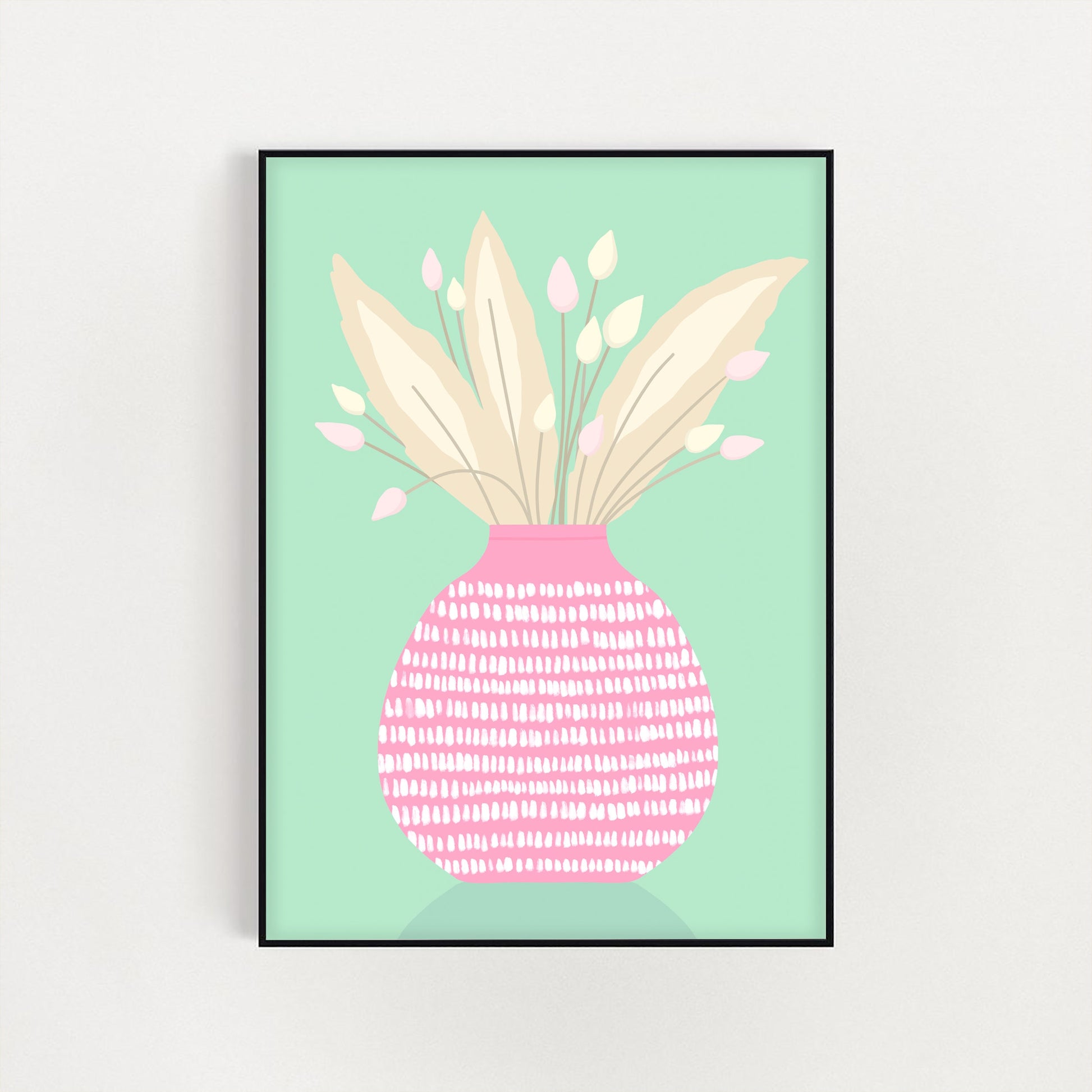 Pampas grass with pastel pink bunny tails in a Mediterranean style vase. A perfect pastel still life that will look lovely in a bedroom, living room or bathroom.