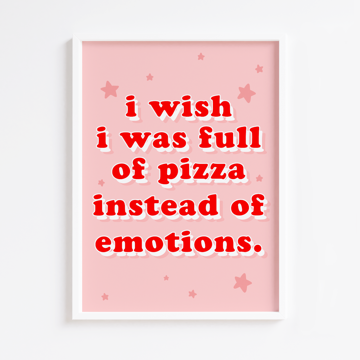 I wish I was full of pizza instead of emotions print. Pink and Red contrast, the perfect clashing colours for that retro edge!