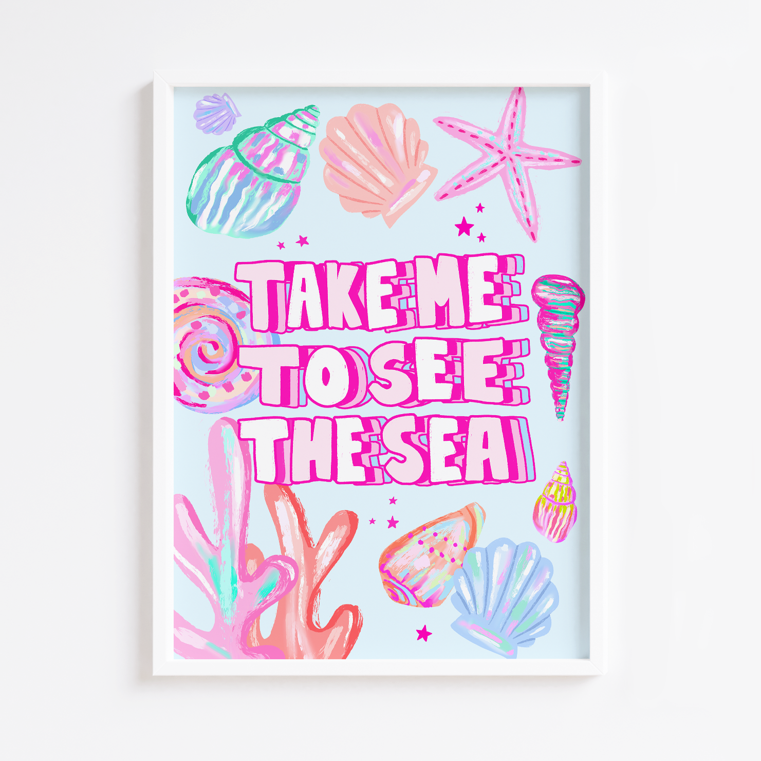 Take me to see the sea print. Hand-drawn typographic and shell illustration against a pastel blue or pink background!