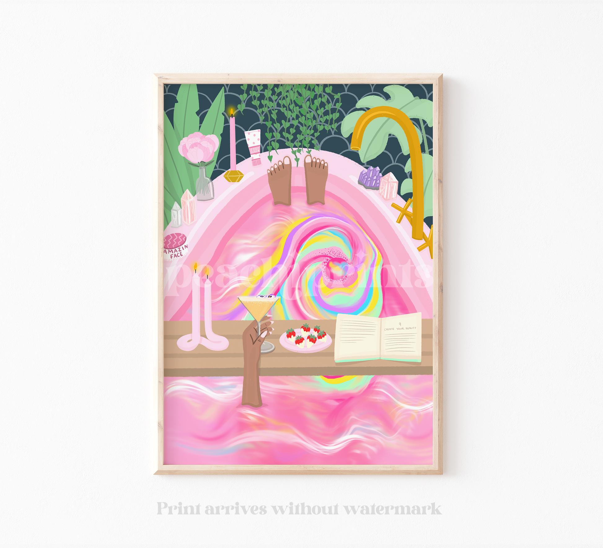 Is this not the most perfect bath experience? A pink bath with a rainbow bath bomb on the go, surrounded by your fav things! This print will be sure to give you some bath time goals. Perfect for your bathroom or bedroom to give off some vibrant chilled vibes!