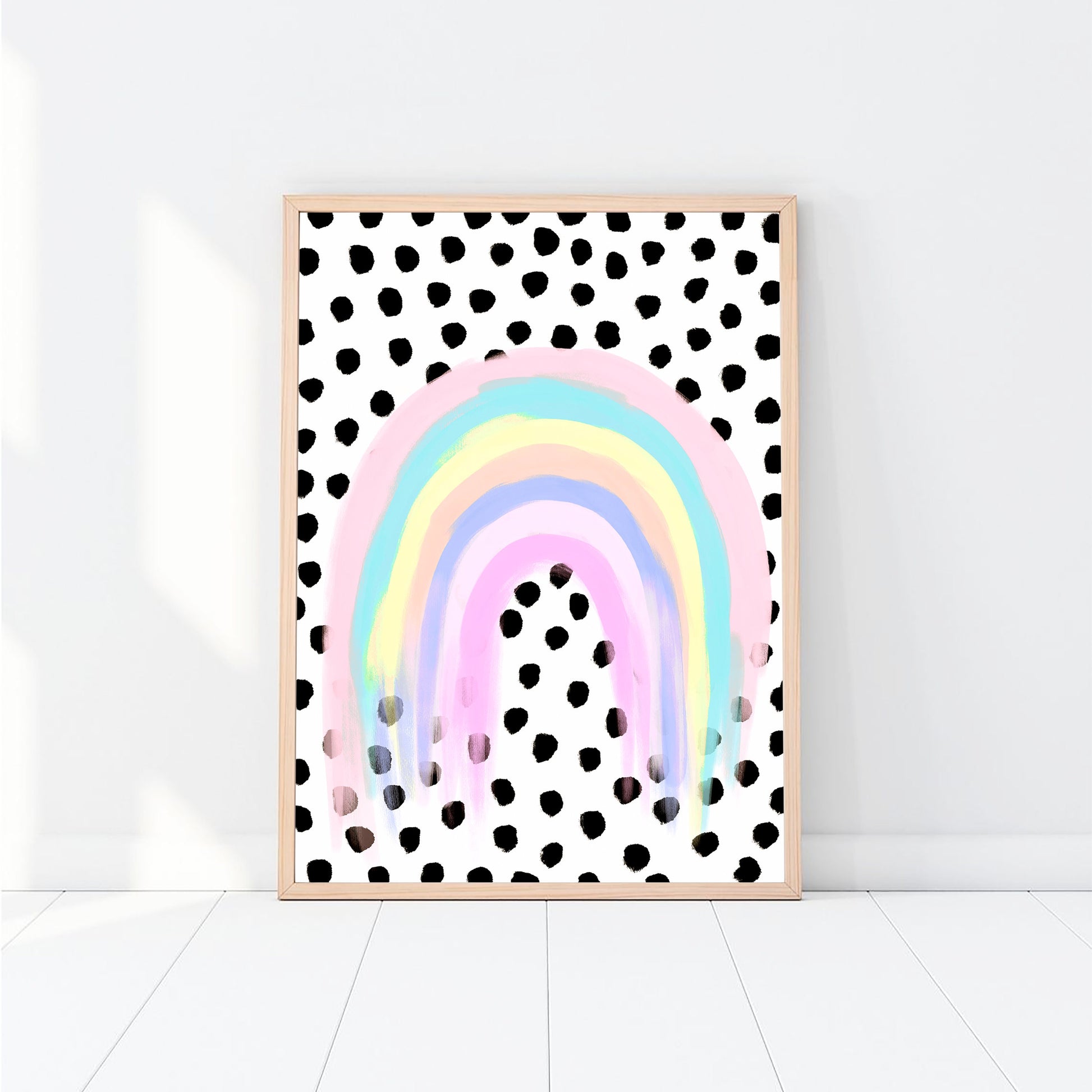 A pastel melting rainbow on a contrasting spotty dalmatian print background. Would look just fab in a gallery wall display or on its own to brighten up any space in your home!åÊ