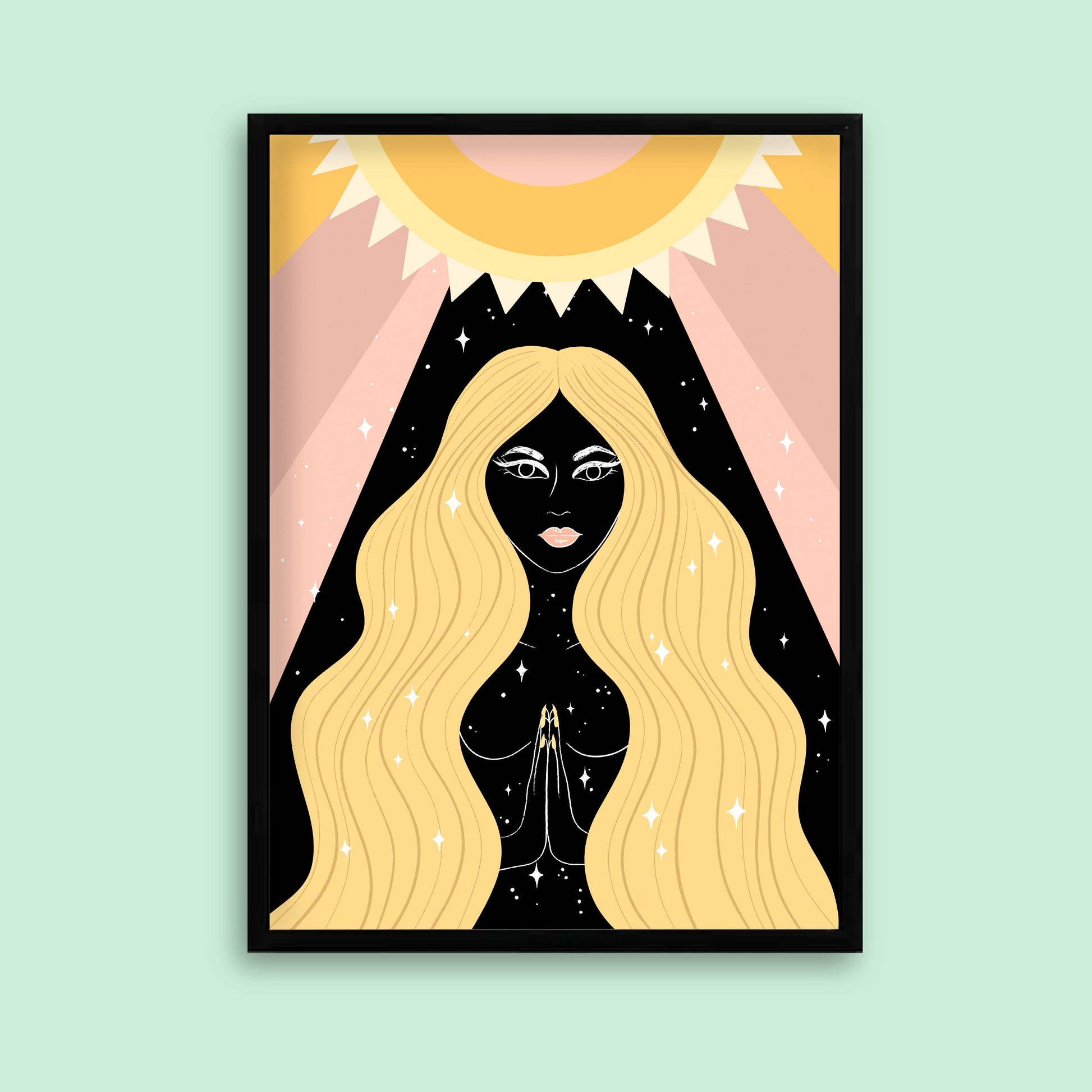 The Sun Goddess print! She will watch over you and cast sunshine over you all year around, so you'll never be without inner sunshine! Perfect to jazz up your hallway, bedroom or living room! Original illustration.
