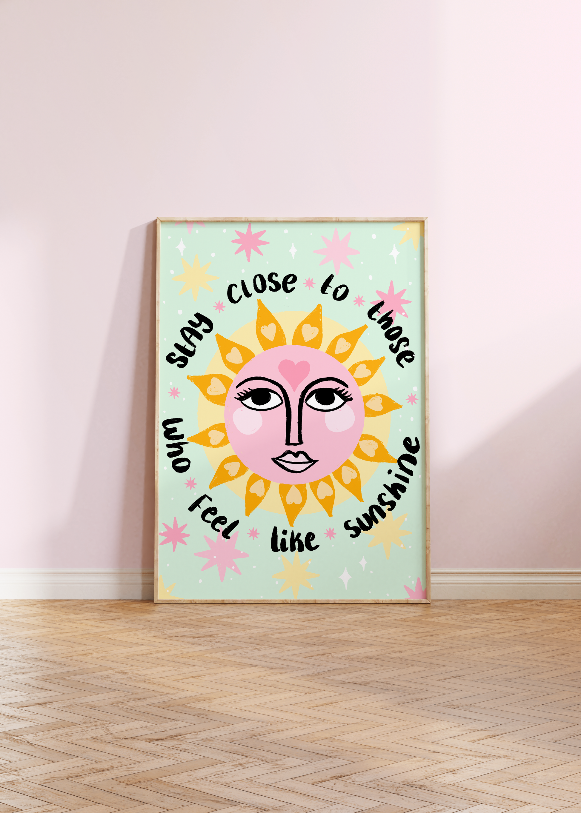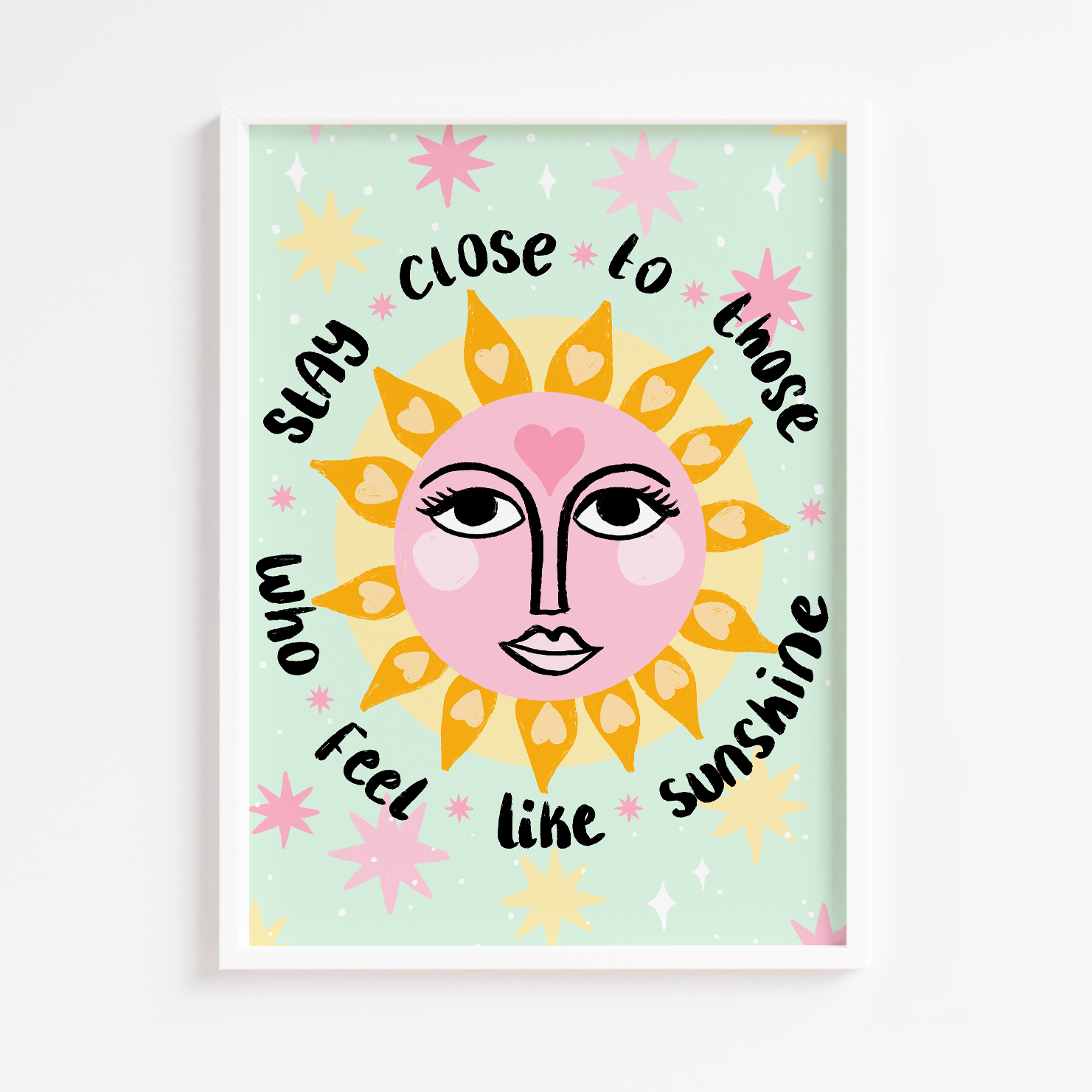 Stay close to those who feel like sunshine Art Print. Hand-drawn, original illustration print. Beautiful boho art in colourful pastel tones. This will for sure add some sunshine and positivity to your space! This would also make the perfect gift for any loved one.