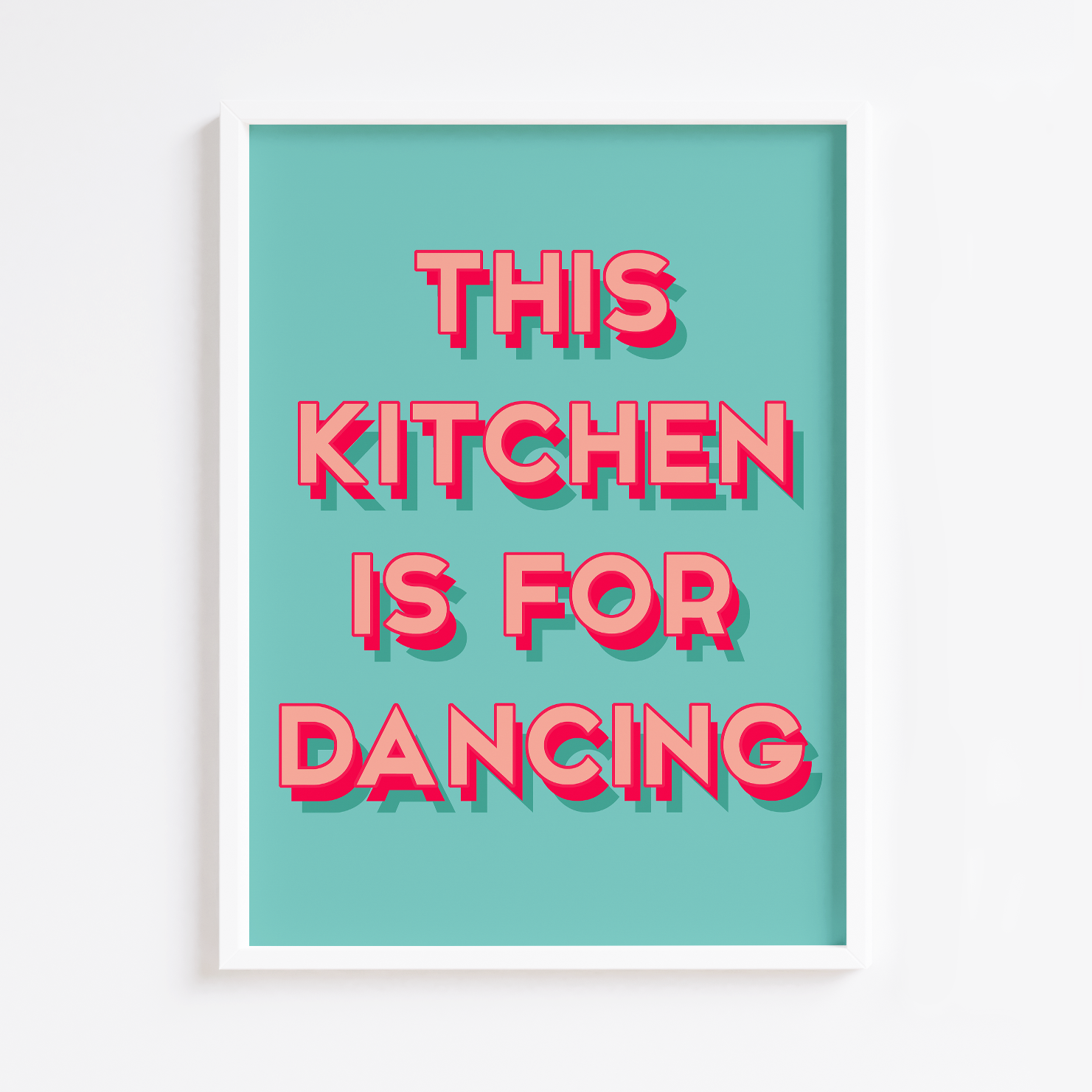 This Kitchen is for Dancing Print. Original typographic and illustration. Perfect for adding happy colour to your kitchen!