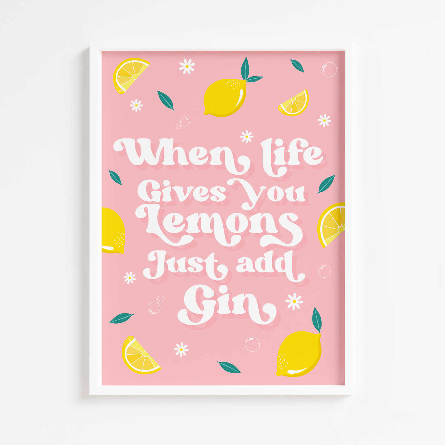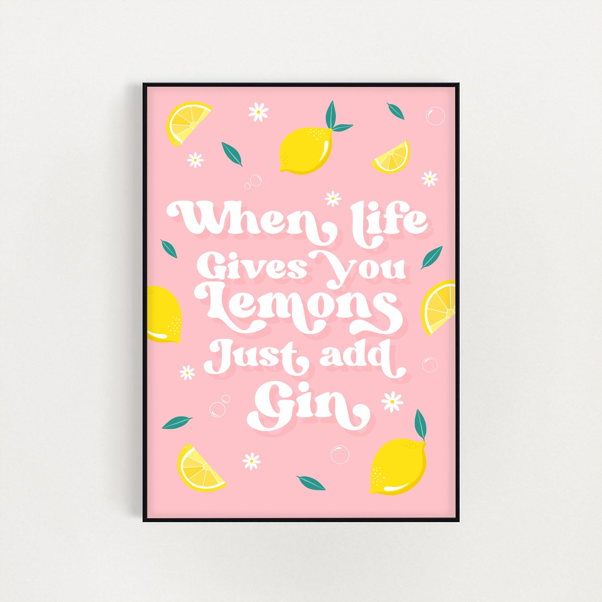 When lives gives you lemons just add gin print! Original retro typographic with cute lemons, daisies and bubbles! Perfect to freshen up your kitchen, laundry room or hallway with bright happy colour!