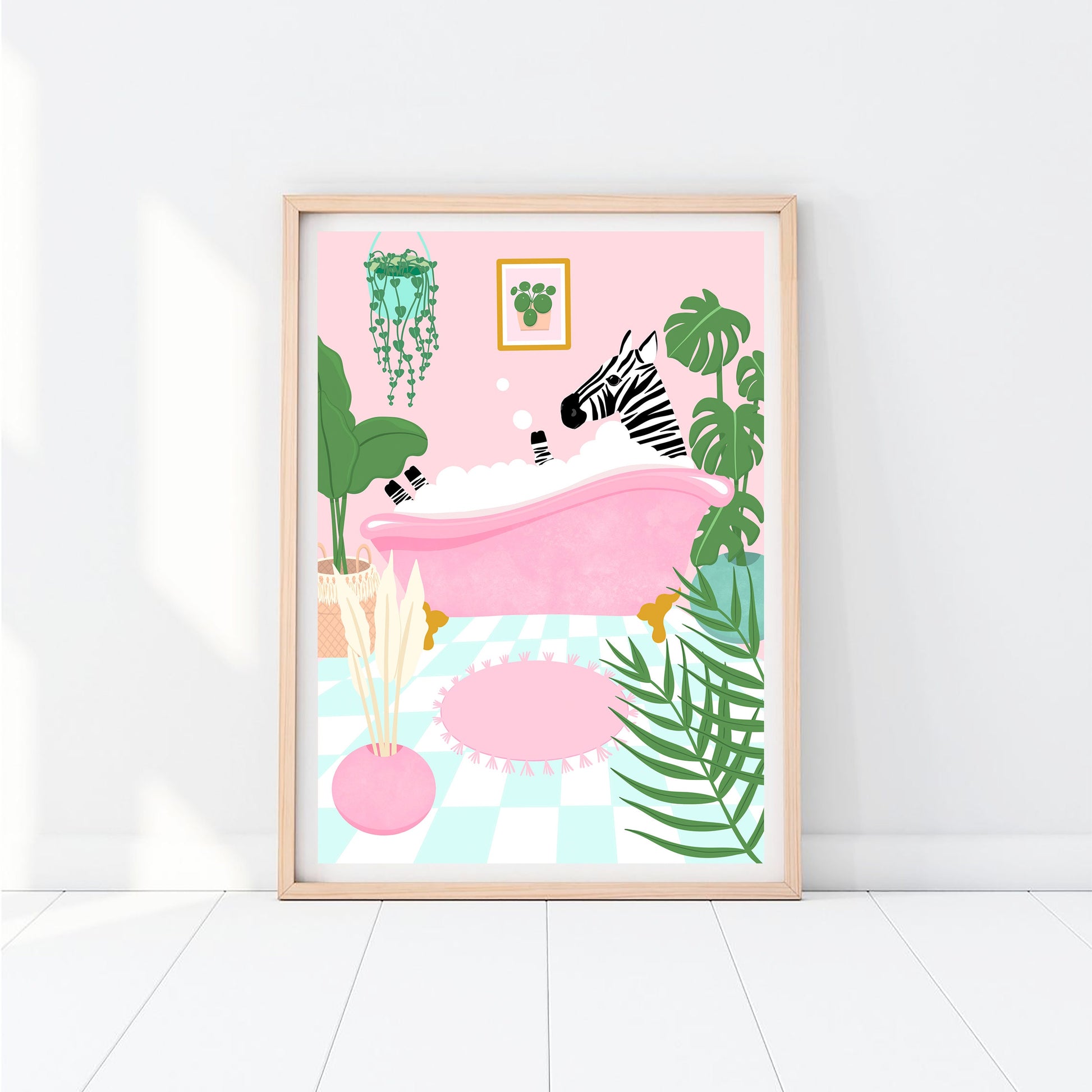 A Zebra soaking away in a rather lovely pink bath, surrounded by plants! What is not to love here?! Perfect for your bathroom or bedroom to give off some vibrant chilled vibes!
