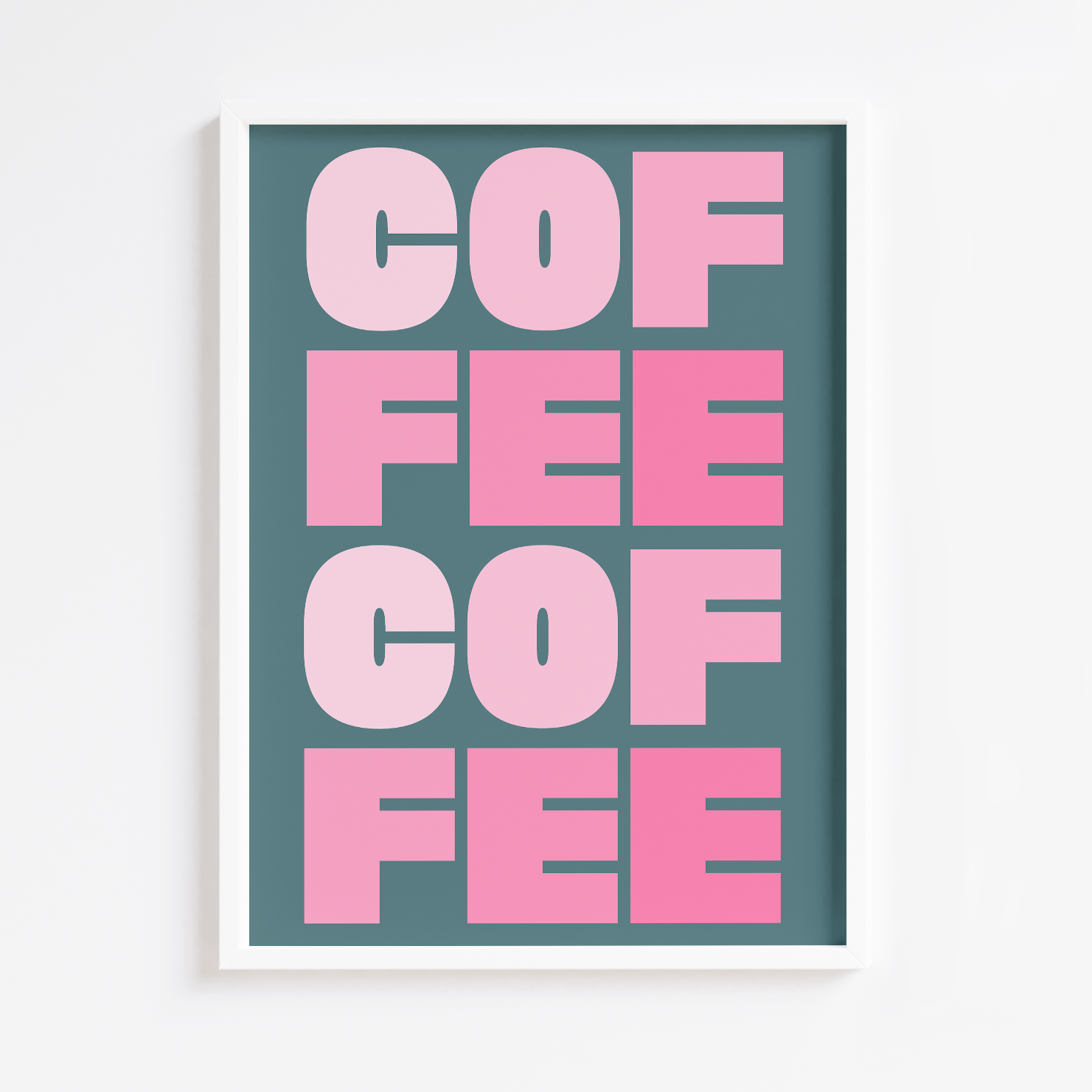 Bold Coffee art print. Multi-tonal pink typographyåÊand teal background. Perfect on-trend statement print for any kitchen or living space.åÊArt print only. Frame not included.