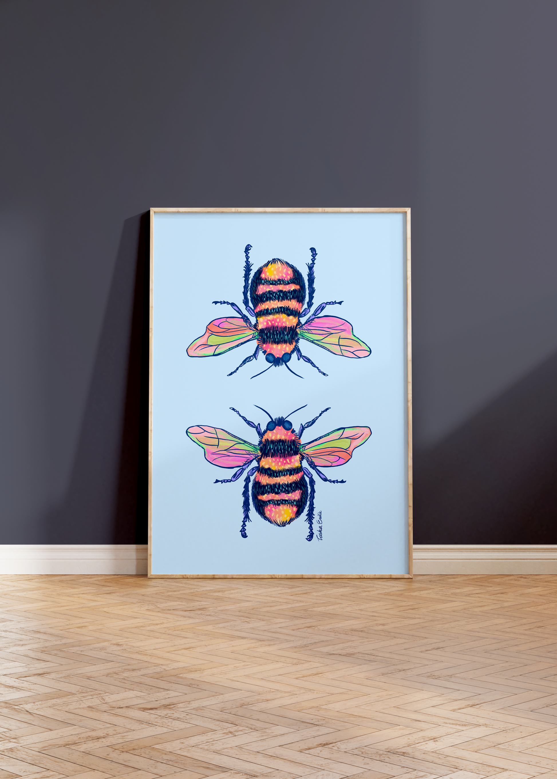 Gouache Bees Duo Print. Two painted bee's with beautiful colours and textures. Available with 3 background colours. Perfect to add a touch of nature anywhere!