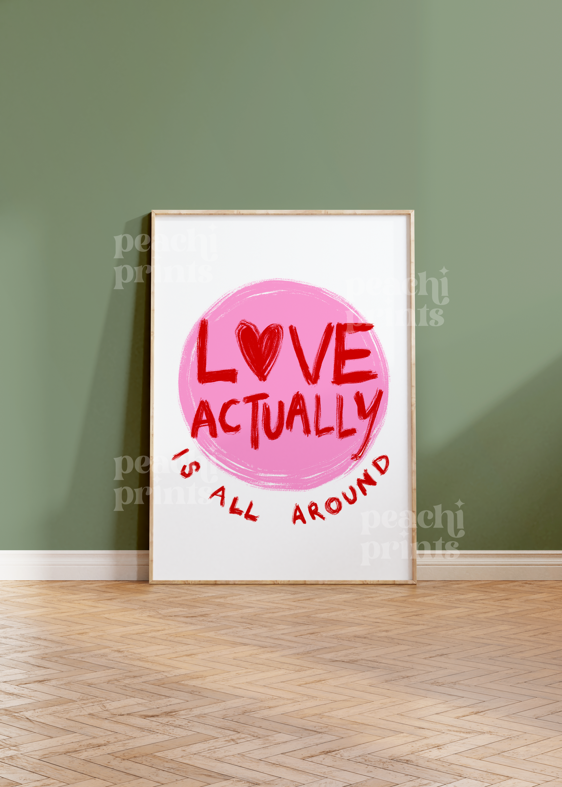 Love Is All Around print. You're here for the iconic movie quote of dreams! Spread the love and positivity around your home with this gorgeous and simplistic design in stark red, pink and white. Hand-drawn typography and illustration print in dry brush.