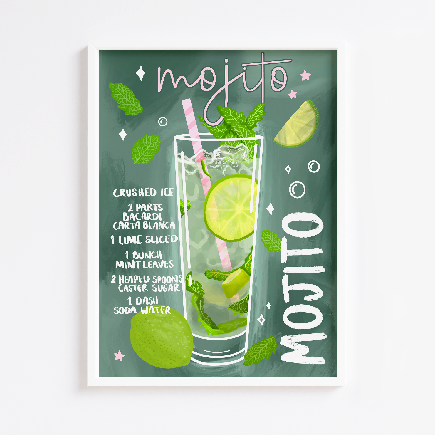 MojitoåÊcocktail print with recipe! Original hand-drawn illustration by me. This would be perfect for the kitchen or above your at home cocktail bar! It would also make the perfect gift for any lover of this drink!