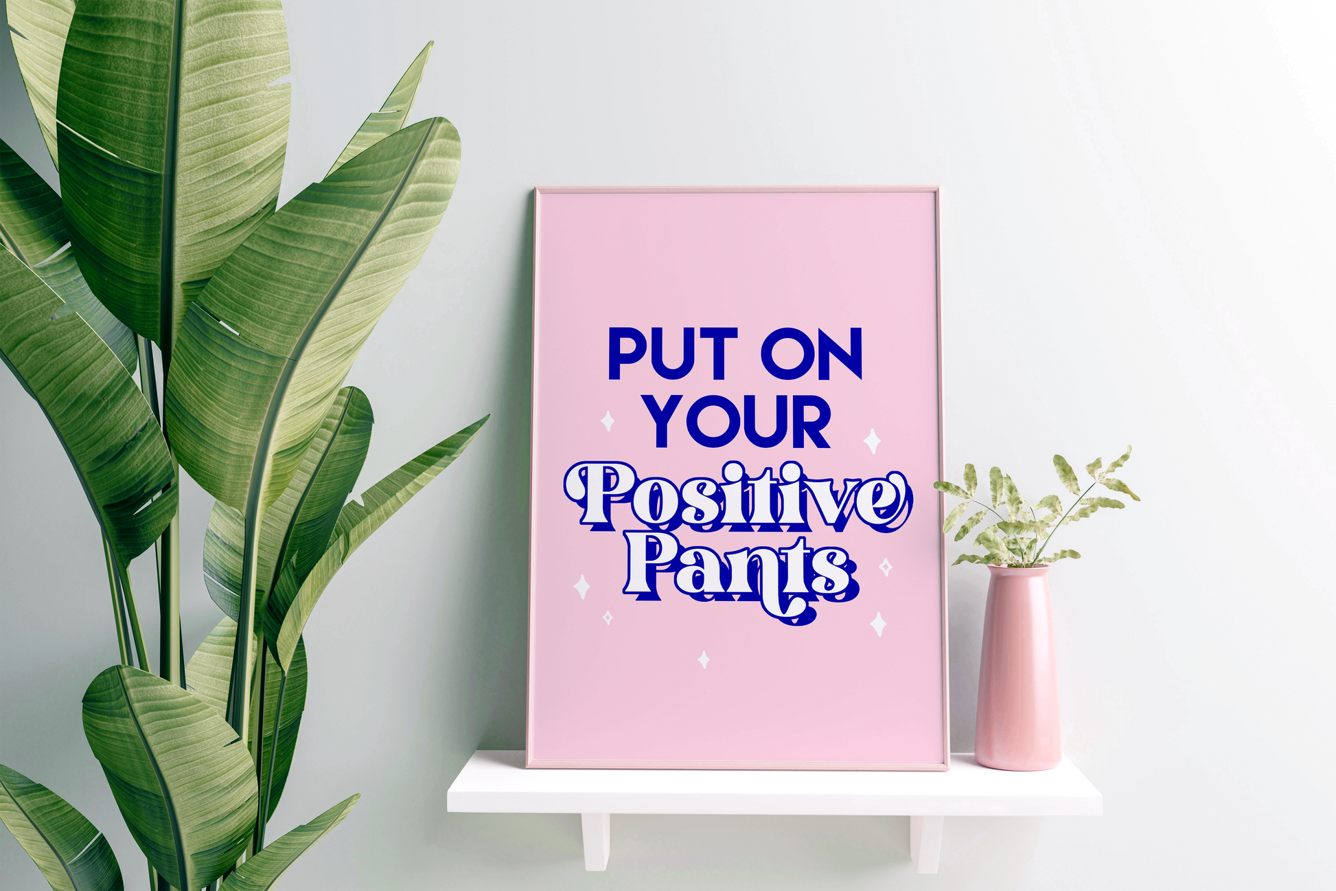 Put on your Positive Pants Print. Fun, motivating print for the bedroom, office or dorm room! Choose between all pink or a gorgeous contrasting blue font!