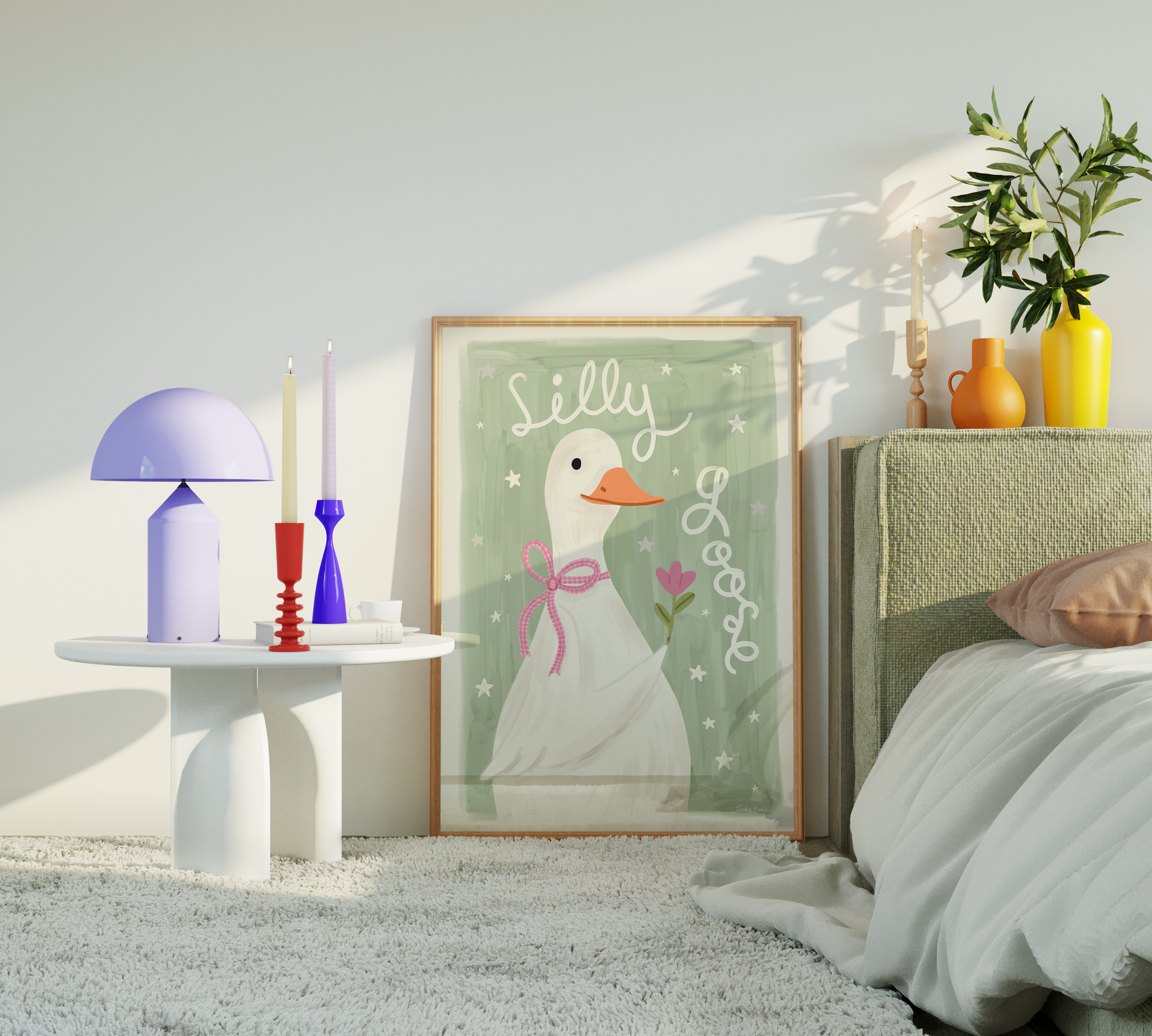 Cute painted goose with pink gingham bow, holding a little pink flower. Available in a choice of 3 colour washes; sage green, rose and blue. Perfect print for a living room, bedroom or nursery!