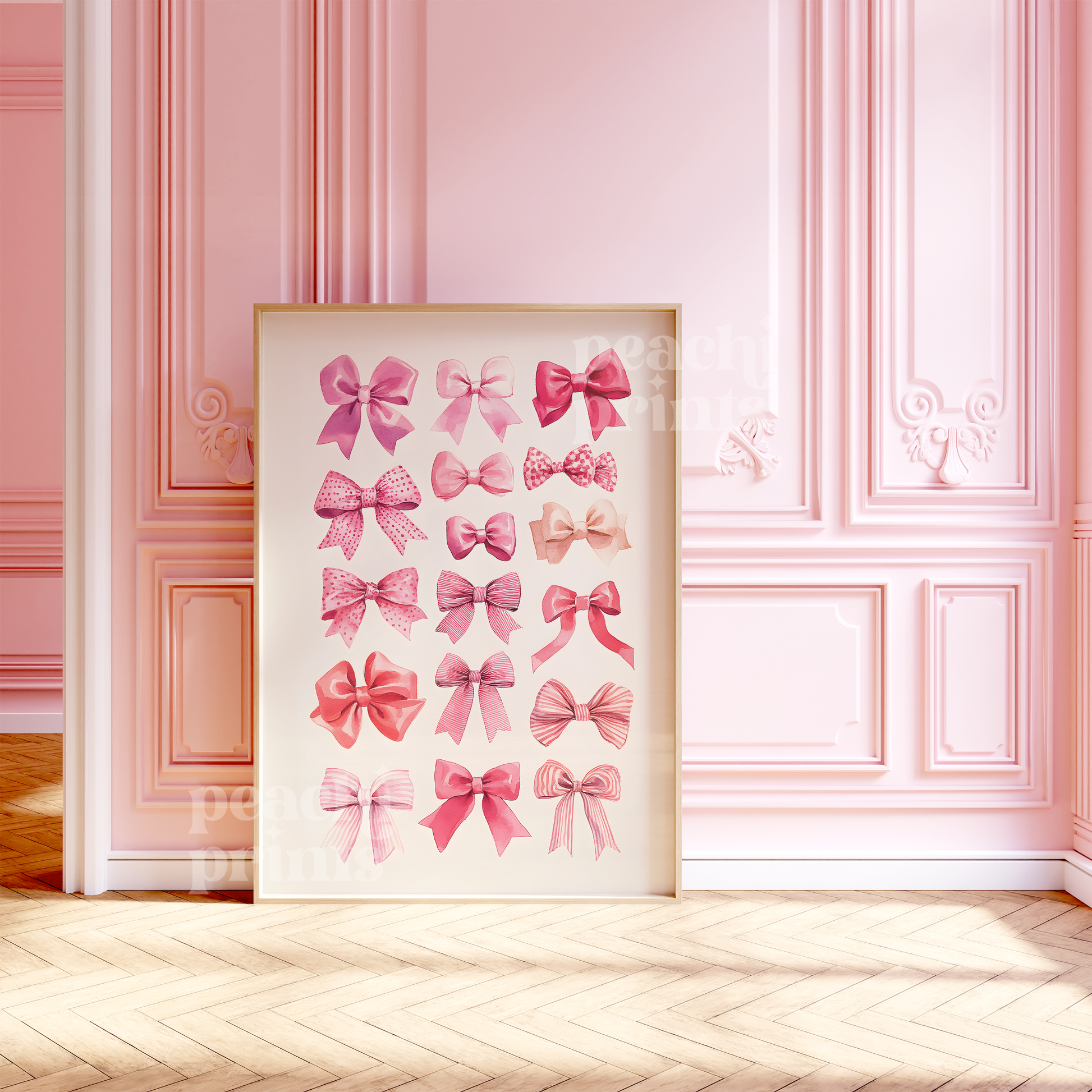 5 rows of oh-so-cute vintage pink bows in varying shades and patterns. A beautiful simplistic print to add a retro chic touch to any space! Perfect for the bedroom or dressing area!